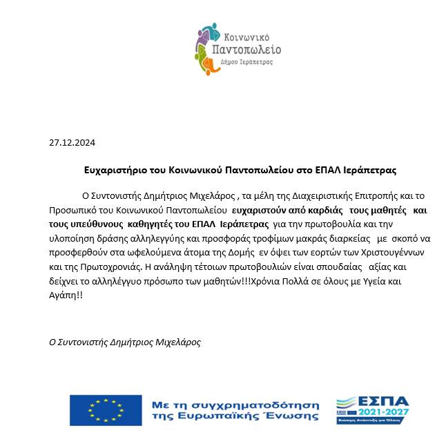 Ευχαριστήριο του Κοινωνικού Παντοπωλείου στο ΕΠΑΛ Ιεράπετρας