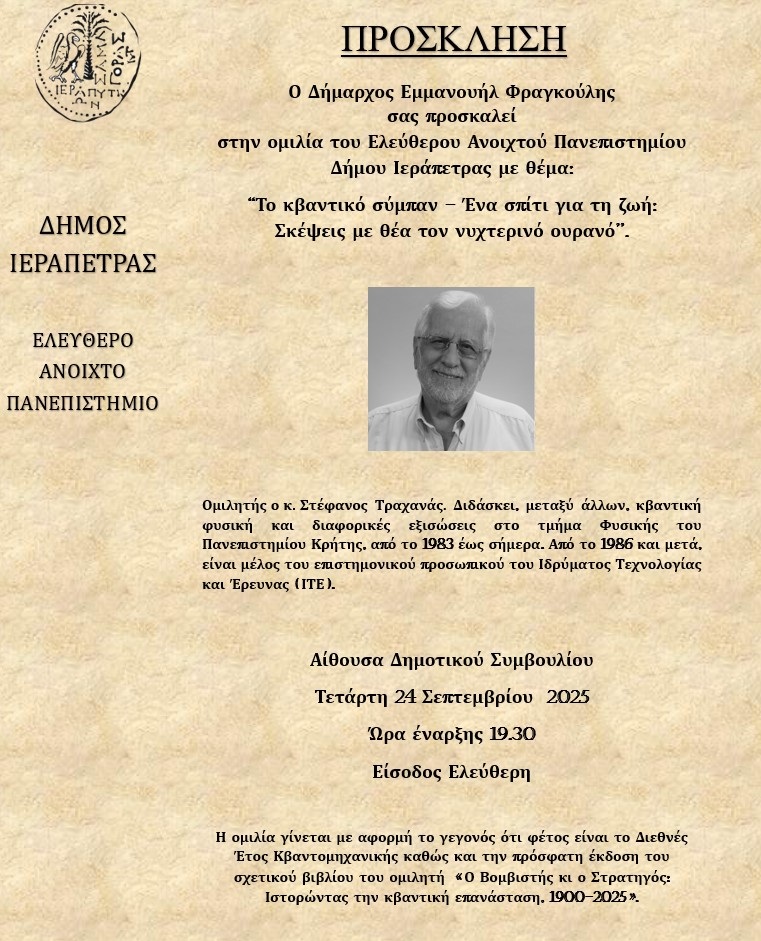 Ομιλητής ο κ. Στέφανος Τραχανάς. Διδάσκει, μεταξύ άλλων, κβαντική φυσική και