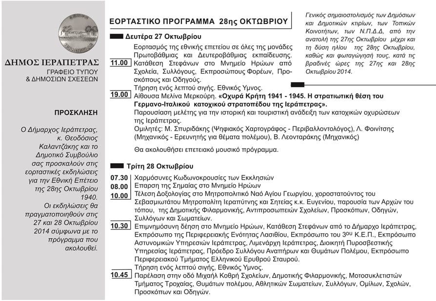 Το απόγευμα της Δευτέρας 27 Οκτωβρίου στις 19:00 στην αίθουσα Μελίνα Μερκούρη θα πραγματοποιηθεί η επετειακή εκδήλωση του δήμου Ιεράπετρας για τον εορτασμό της 28ης Οκτωβρίου.