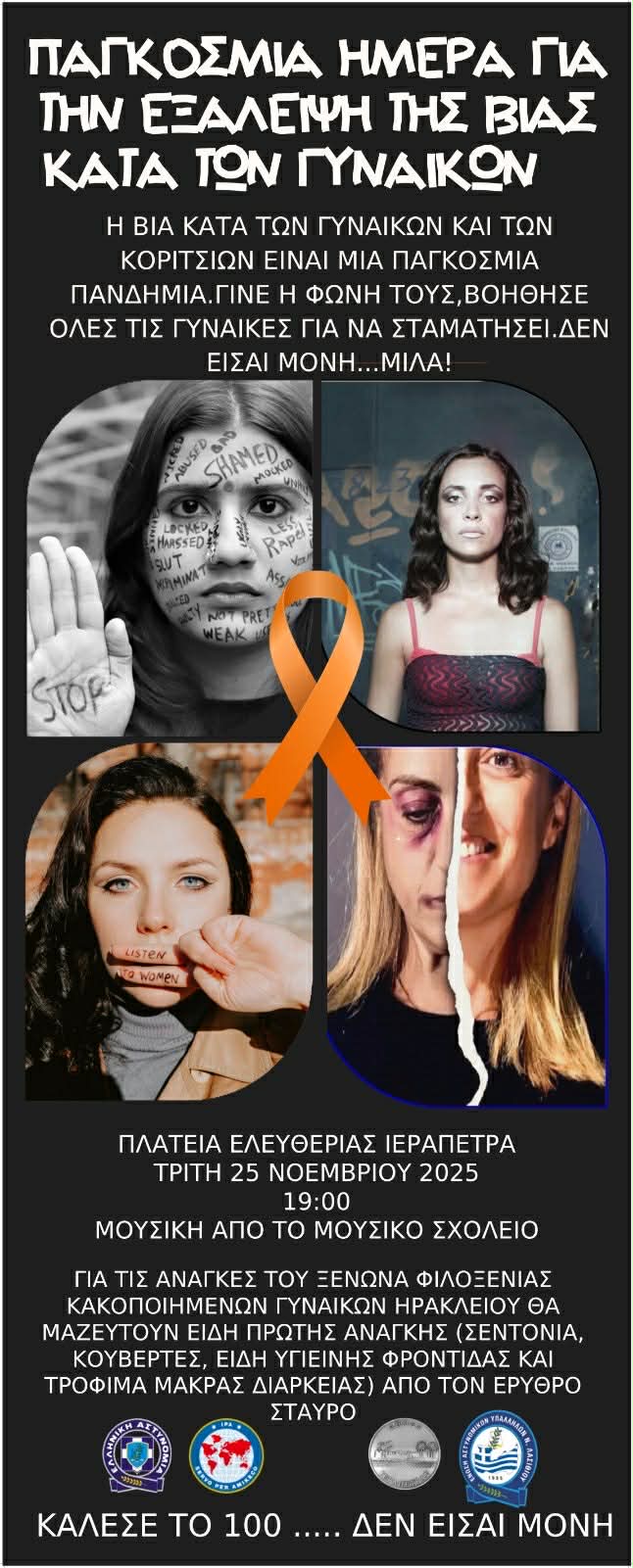 Με αφορμή τη Διεθνή Ημέρα για την εξάλειψη της βίας κατά των γυναικών, η Επιτροπή Ισότητας  σε συνεργασία με το Τμήμα Κοινωνικής Πολιτικής και Ισότητας των Φύλων του Δήμου Ιεράπετρας,  με τη συμβολή της Ομάδας Κοινωνικής Πρόνοιας Ελληνικού Ερυθρού Σταυρού και των σχολείων Δευτεροβάθμιας εκπαίδευσης, διοργανώνει δράσεις την Τρίτη 25 Νοεμβρίου και ώρα 19.00 στην Κεντρική Πλατεία της πόλης.