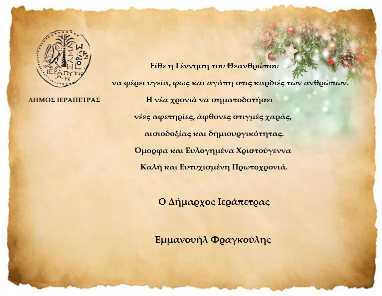 Σας προσκαλούμε στις 29-12-2025, ημέρα Δευτέρα και ώρα 9:00 σε τακτική συνεδρίαση της Δημοτικής Επιτροπής Δήμου Ιεράπετραςπου θα διεξαχθεί στο Δημοτικό Κατάστημα, Δημοκρατίας 31 στην αίθουσα «ΙΩΑΝΝΗΣ ΧΡΙΣΤΑΚΗΣ» στον 1ο όροφο για τη συζήτηση και λήψη αποφάσεων στα παρακάτω θέματα: