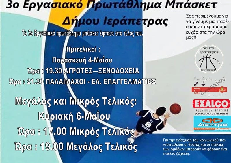 [dropcap]Τ[/dropcap]ο εργασιακό πρωτάθλημα μπάσκετ του Δήμου Ιεράπετρας τελειώνει. Την Παρασκευή, 19.30 και 21.30, θα γίνουν οι ημιτελικοί, το Σάββατο, 18.00 και 20.00, τα παιχνίδια κατάταξης Θέσεων 5-9 και την Κυριακή, 17.00 και 19.00, ο Μικρός και Μεγάλος Τελικός.
