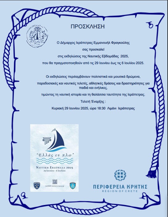 Η Ναυτική Εβδομάδα και τα Παιδικά Κύρβεια του Δήμου Ιεράπετρας συναντιούνται σε μια γιορτή χαράς, δημιουργίας και συμμετοχής, με κοινό τόπο την αγάπη για τη θάλασσα, την παράδοση και το μέλλον του τόπου μας.