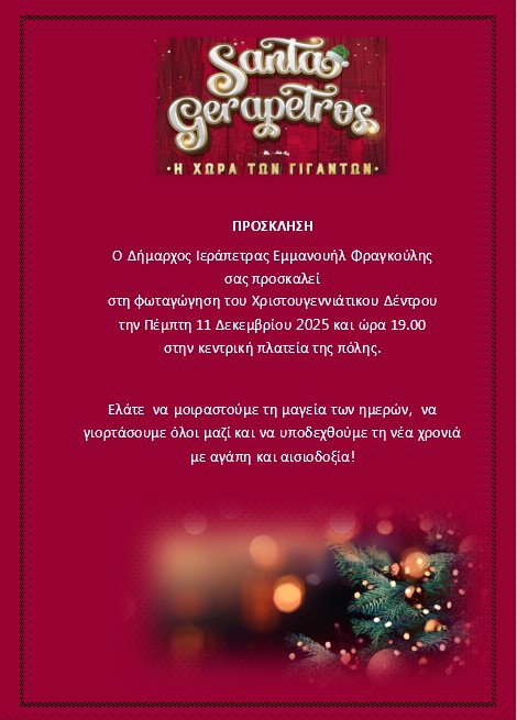 Ο Δήμαρχος Ιεράπετρας Εμμανουήλ Φραγκούλης σας προσκαλεί στη φωταγώγηση του Χριστουγεννιάτικου Δέντρου, την Πέμπτη 11 Δεκεμβρίου 2025 και ώρα 19.00 στην κεντρική πλατεία της πόλης.