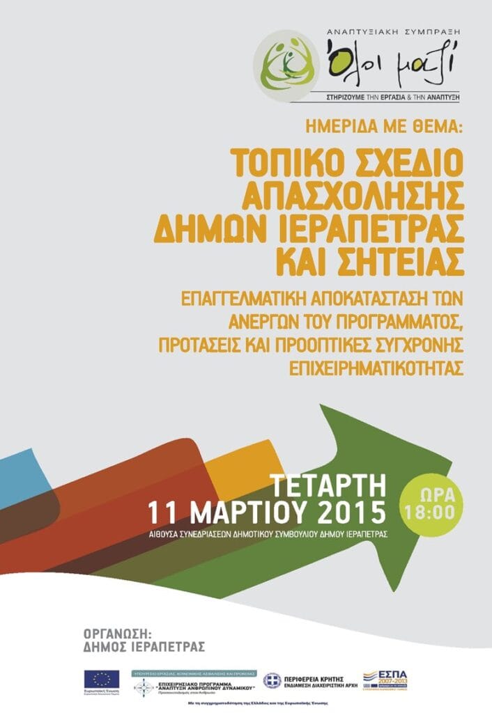 Εσπερίδα με θέμα προτάσεις και προοπτικές σύγχρονης επιχειρηματικότητας μέσα από το πρόγραμμα «Τοπικό Σχέδιο Απασχόλησης Δήμων Ιεράπετρας και Σητείας» – Τετάρτη 11 Μαρτίου 2015. Αναλυτικά το πρόγραμμα κλπ