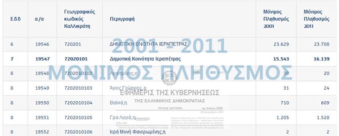 Πίνακας σύγκρισης Μόνιμου Πληθυσμού του Δήμου Ιεράπετρας αναλυτικά ανά χωριό (τοπική κοινότητα) και ανά οικισμό για τις απογραφές πληθυσμού 2001 και 2011. Σύγκριση δήμων Λασιθίου. Πληροφορίες και ΦΕΚ απογραφής.