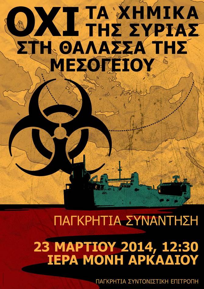 Παγκρήτια συνάντηση ενάντια στην Καταστροφή των χημικών της Συρίας στη Μεσόγειο που θα πραγματοποιηθεί στο μαρτυρικό Αρκάδι την Κυριακή 23.3.2014 και ώρα 12:30. Ο κίνδυνος που απειλεί την κλειστή λεκάνη της Μεσογείου είναι άμεσος