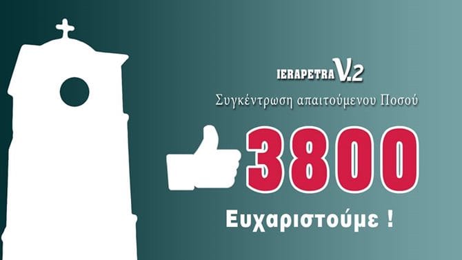 Με επιτυχία κατάφερε η εθελοντική ομάδα Ierapetra V2 να συγκεντρώσει το ποσό των 3800 ευρώ που χρειαζόταν για την αγορά ρολογιού, στο ”Καμπαναριό” των ψαράδων, της ενορίας Αφέντη Χριστού Ιεράπετρας ! Εκατοντάδες πολίτες στήριξαν την καμπάνια της ομάδας.