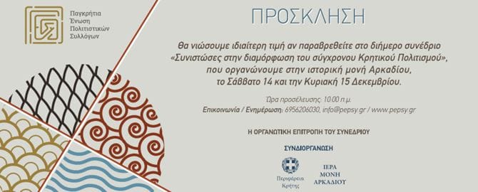 Η Προσωρινή Συντονιστική Επιτροπή, της Πρωτοβουλίας για την ίδρυση Παγκρήτιας Ένωσης Πολιτιστικών Συλλόγων διοργανώνει τοΠαγκρήτιο Συνέδριο Πολιτιστικών Συλλόγων στο Αρκάδι 14 και 15 Δεκεμβρίου.